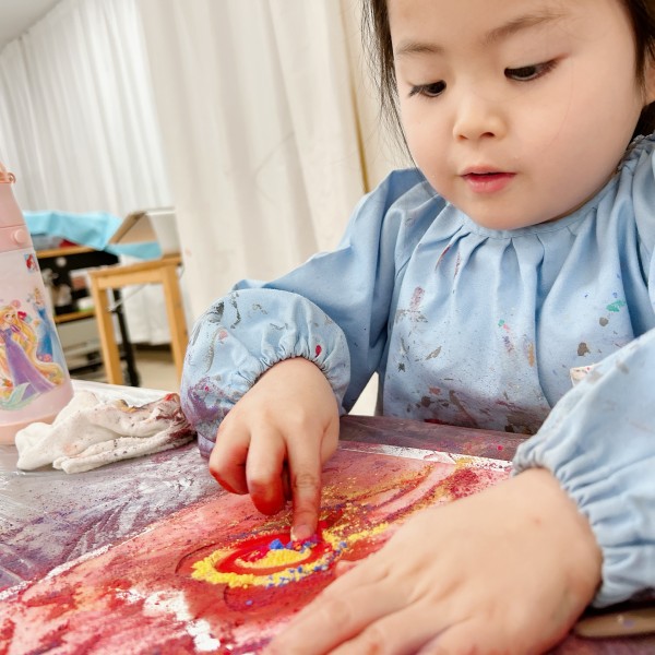 あまりの楽しさに、この花びら作りにずっと夢中になっていた子も。何枚も何枚も描いてみては、次々に試したいことが出てくるようです。きっと手触りも楽しいのでしょう。色まみれになりながら制作に没頭していました。