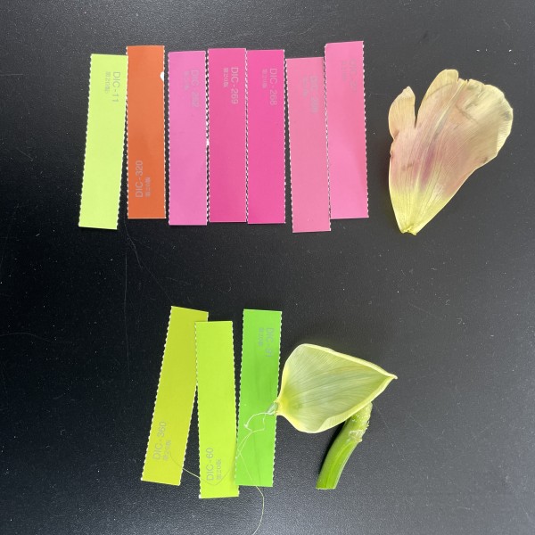 花のいろんな部分の色がちがうということは...「花の形に並べてみたい!」カラーチップを、解剖前の花の形に並べている子もいました。1枚の花びらの中に、実にいろんな色がある様子が見えてきました。