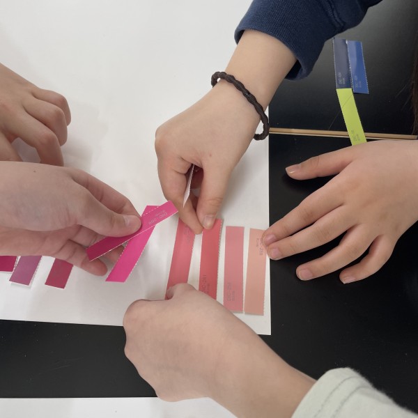 たびたび「目がつかれたあ〜」という言葉が出るほど、みんな真剣に色観察。かなり細かい色のちがいを見分けて、グループごとに協力してグラデーションを完成させていきました。