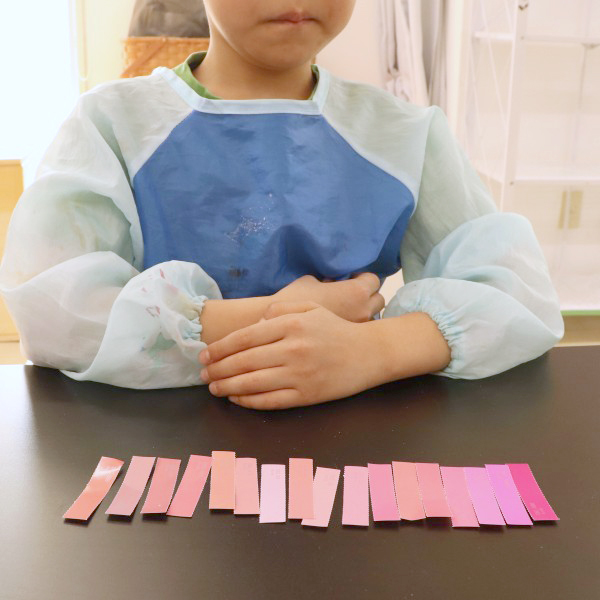 ここからさらに色について体験を深めます。たくさんあるカラーチップを、「あか」「あお」など大まかな色にざっくりと仕分け。試してみると、だんだん「これはどっちの仲間だ?」「青の仲間?」「これは違うねえ」など子ども同士の会話が生まれていきました。