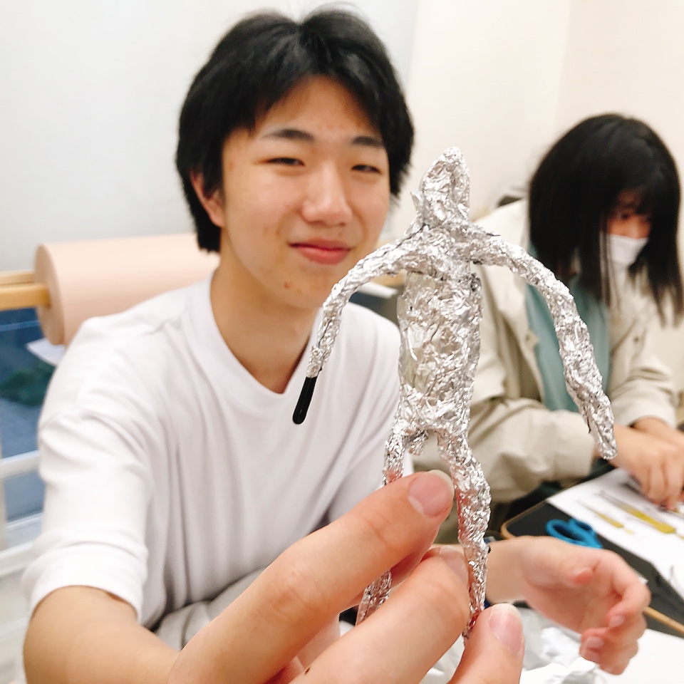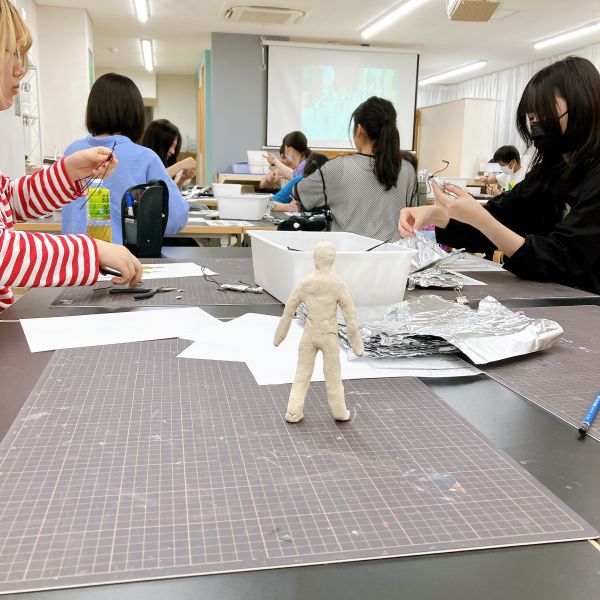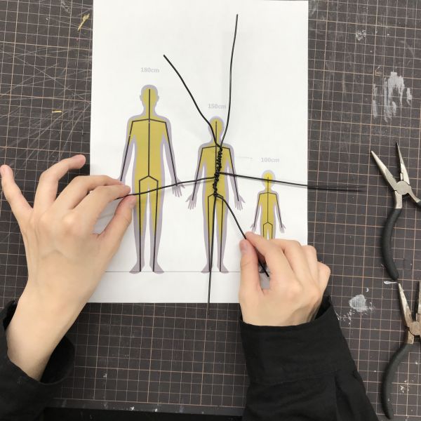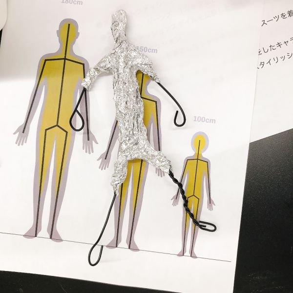 ここから立体制作へ。いろんなポーズを取れる人体を作りたいので、人体の芯材にはワイヤーを用意。針金の扱いが「実はすごく苦手」という声もありましたが、ペンチなどの道具をうまく使って思い通りに進めるにはかなりコツがいる制作です。
