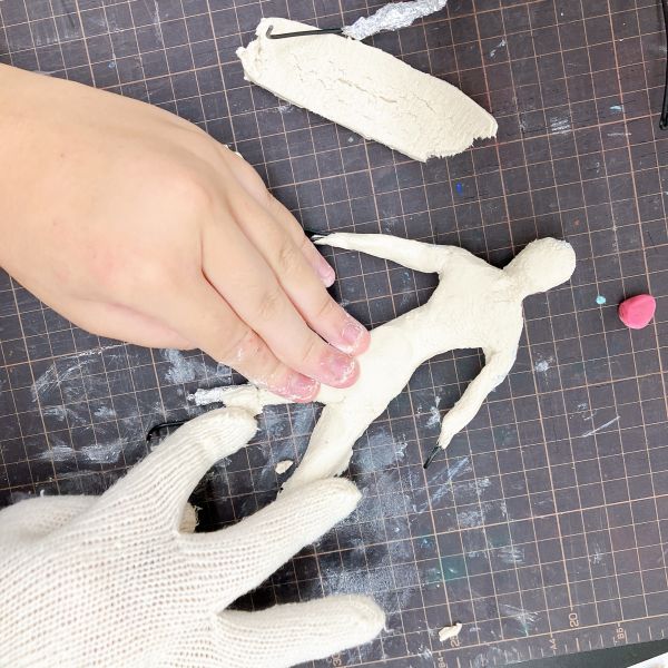 さらに上から粘土で全体を覆っていきます。この回は細部の作り込みよりも、大まかな人の形をつくることが目標。真っ白な状態ですが「早く作り込みがしたい!」とみんなの想像が膨らみ、期待度がどんどん高まっていました。