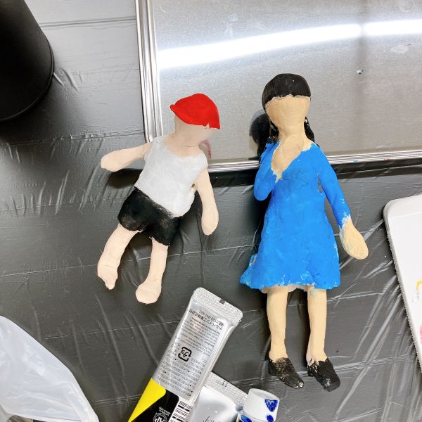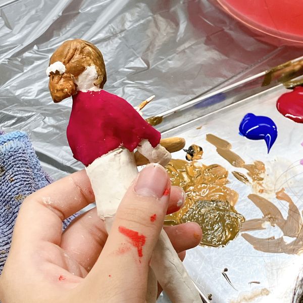 粘土でどうしても表しにくい部分は、色の効果を使って表現することもできます。試しに色をつけてみると、作品の印象がまた大きく変わりました。「絵の具は得意!」という人もいれば、「粘土が楽しい」という人もいるので、それぞれ得意な方法で進めていくのがいいですね。