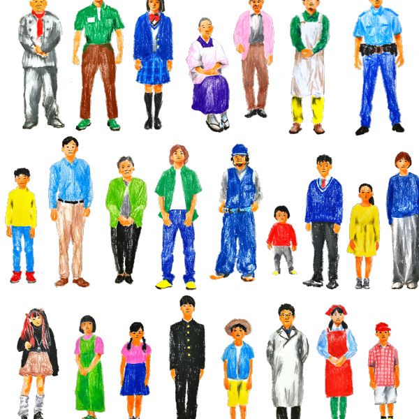 左は、コンビニに行く人。パーカーを着て、ラフにポケットに手を入れて家の近所を歩く様子でしょうか。「ちょっとそこまで」という雰囲気がよく出ていますね。右の肩車をした親子も、「いる、いる!」と思わず納得してしまう姿です。