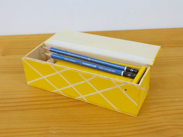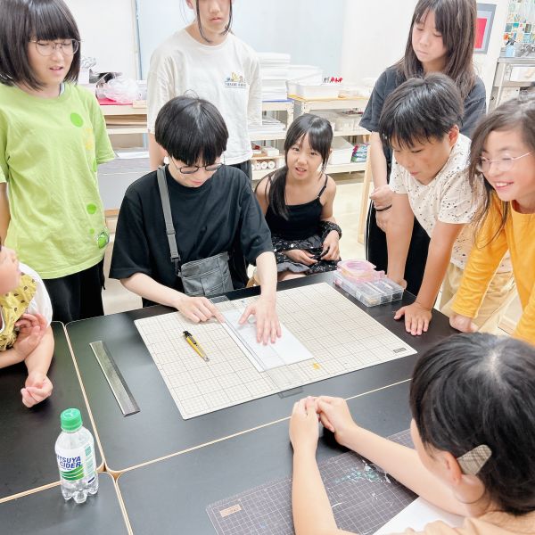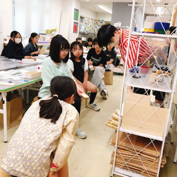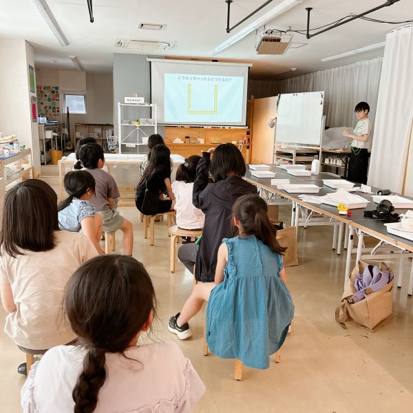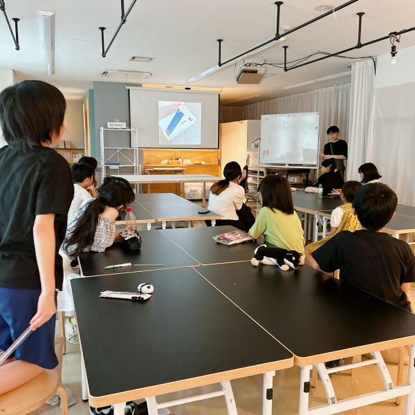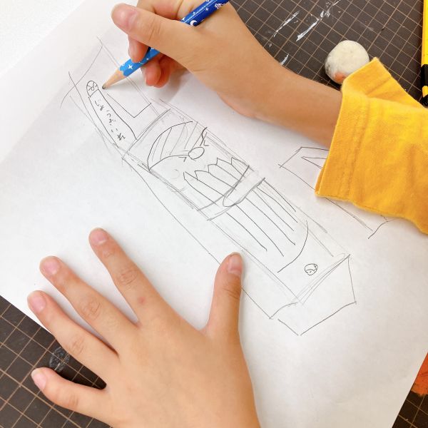 「作っていいの!?」「やったあ」と、教室内の空気がザワザワ...どんな場面で使うか、何を入れたいかなど、それぞれさっそく考え始めたようです。「お弁当箱みたいな2段にしたい」「ねり消しを隠せるとこがほしい」「クレヨンをきれいに収めたい」お互いの案を披露し合いながら、発想を膨らませている様子です。