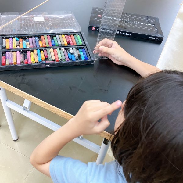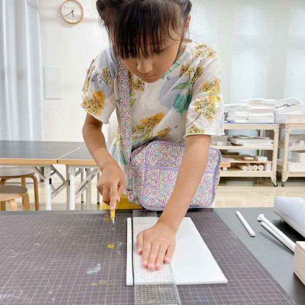 いよいよペンケースの制作に取りかかりました。自分のペンケースについての希望や形のイメージが、なんとなく固まっている子も多く見られました。デザインが始まると、頭も手もフル回転!どこから始めるかは人それぞれで、その進め方自体に、早くもこどもたちの個性がしっかりと表れていました。