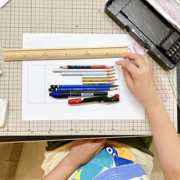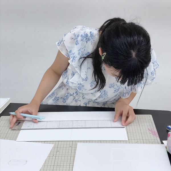 中に入れたいものを、じっくりと観察・分析することから始める子も。文具を並べて、長さを測り、おおよその量なども検討した上で、ペンケース全体のサイズや形状を検討していました。