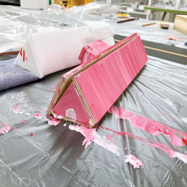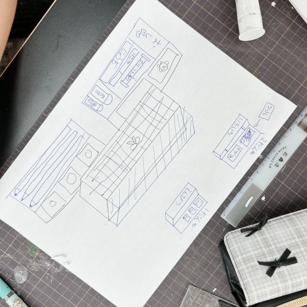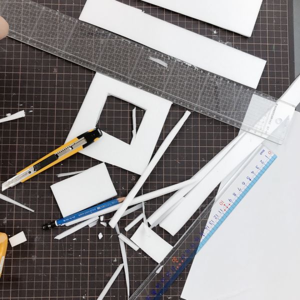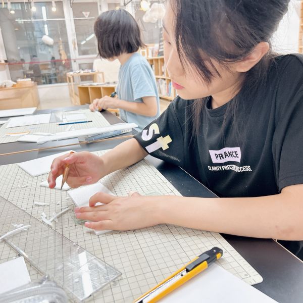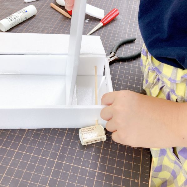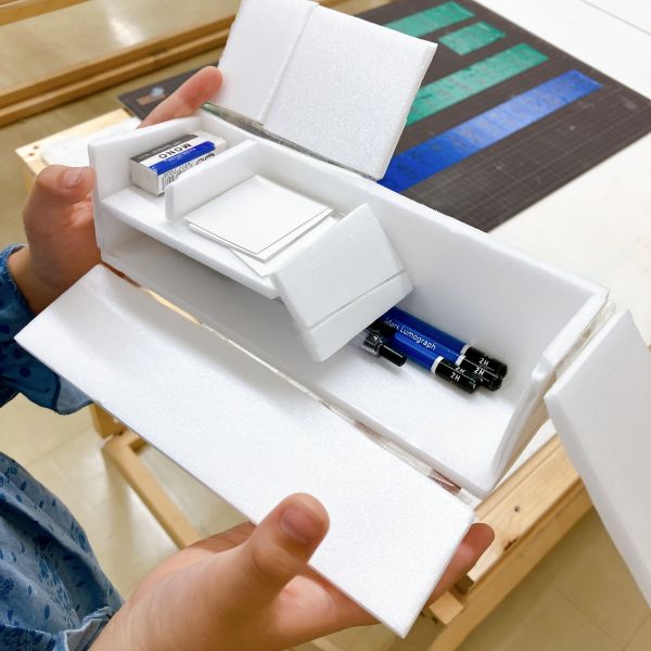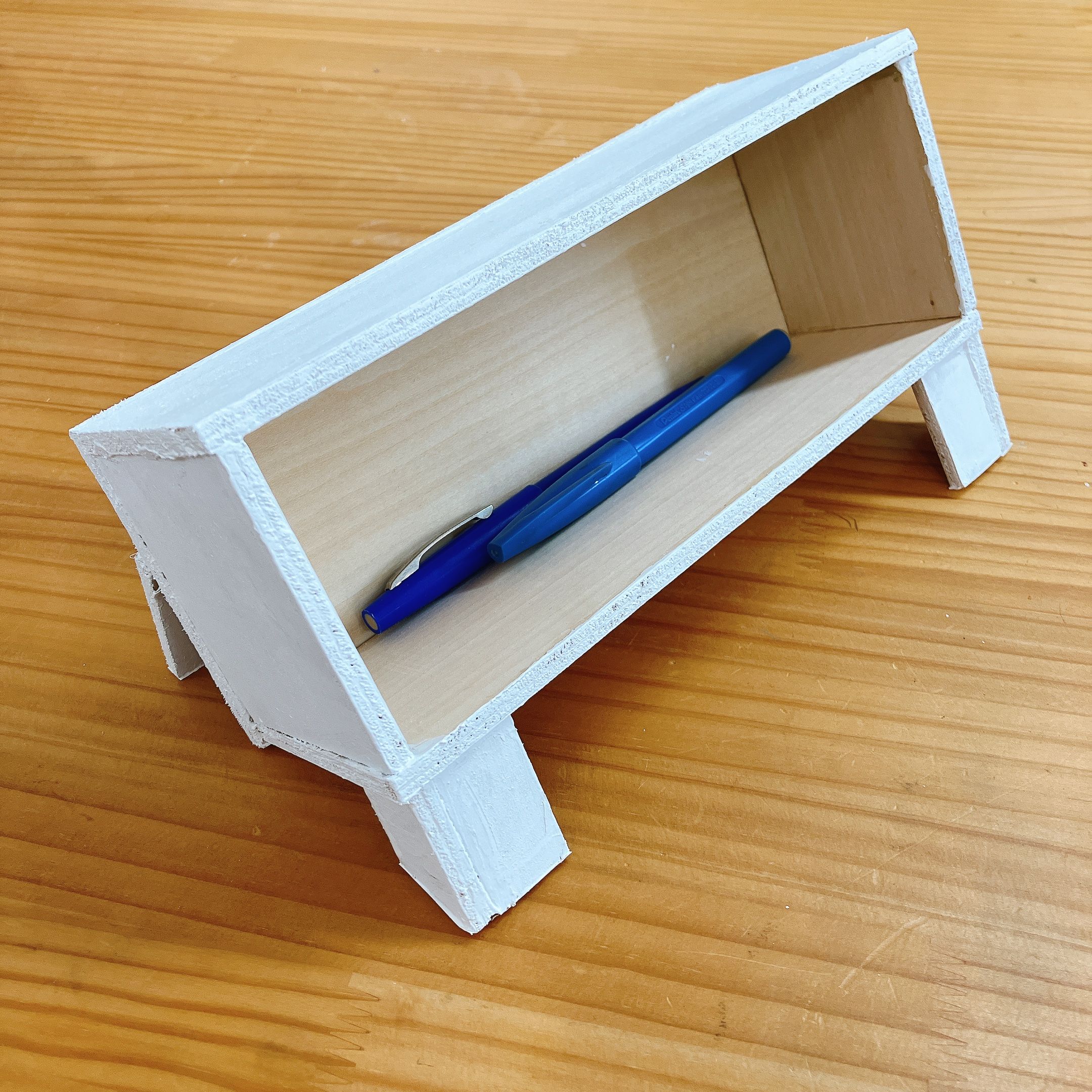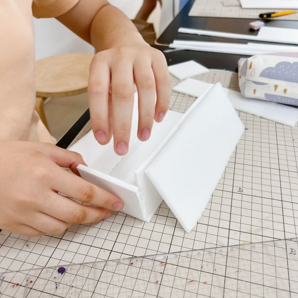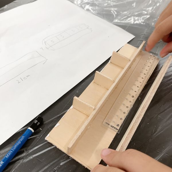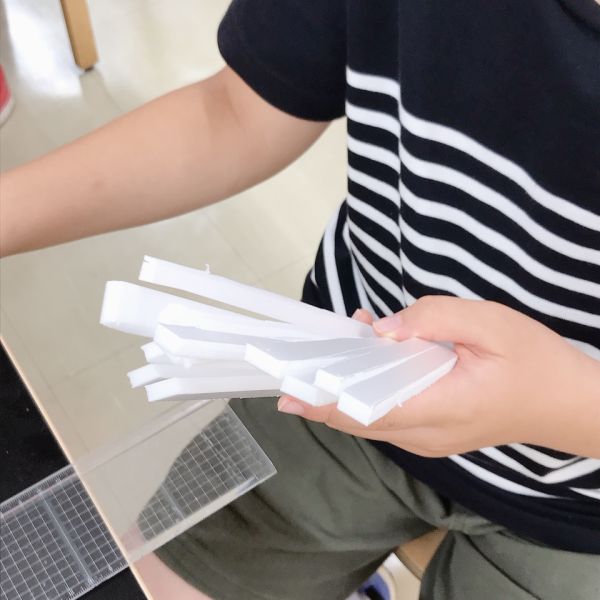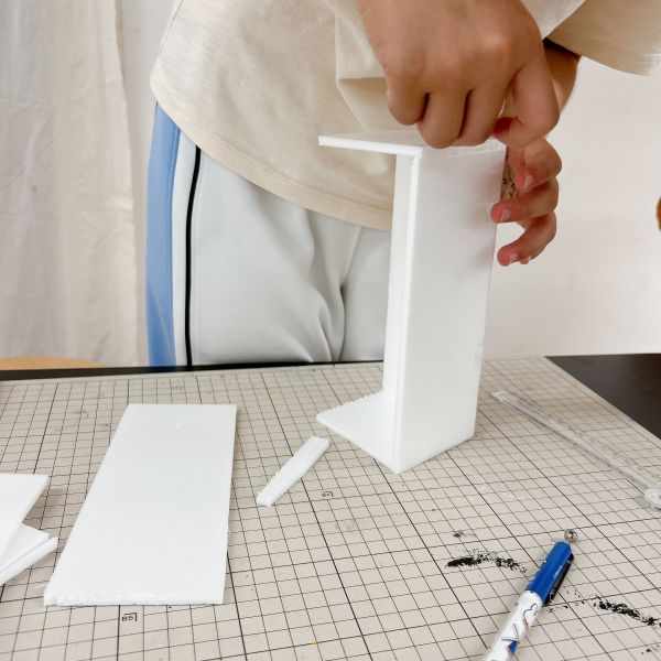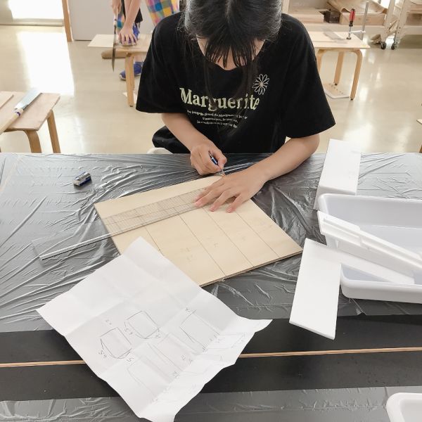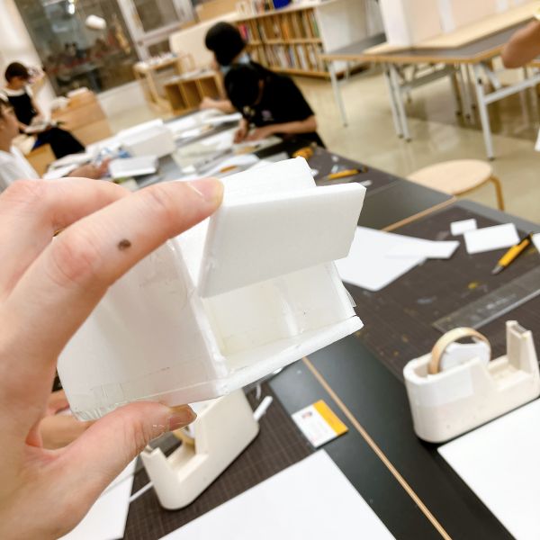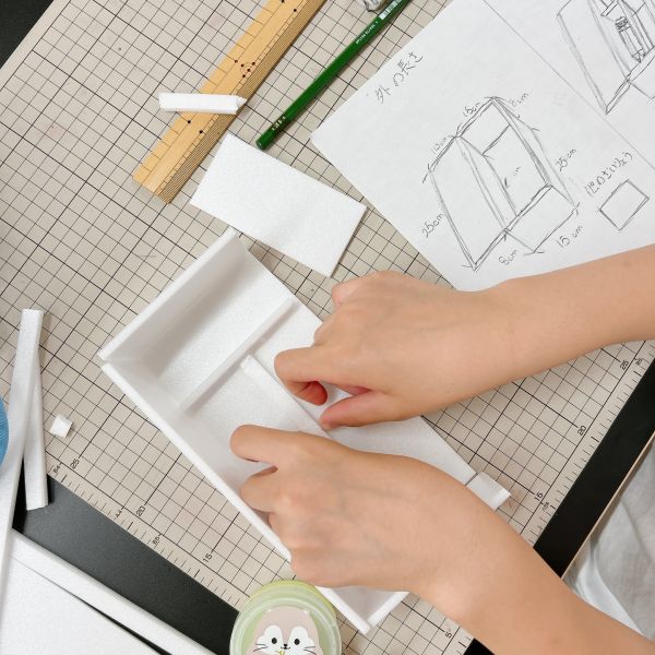 絵に描くだけではいまいち想像がつかない部分もあるので、実物大のプロトタイプを作ってみることに。その中に実際に文具を入れてみて、サイズは良いか、使いやすいかどうかなどを試してみることで、細かな部分までしっかりとデザインできそうです。最終的に使う木の板とほぼ同じ厚みのスチロール板で模型を作ります。