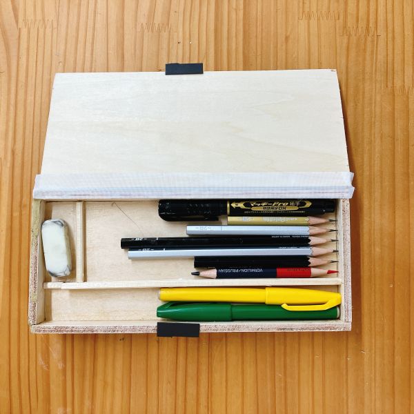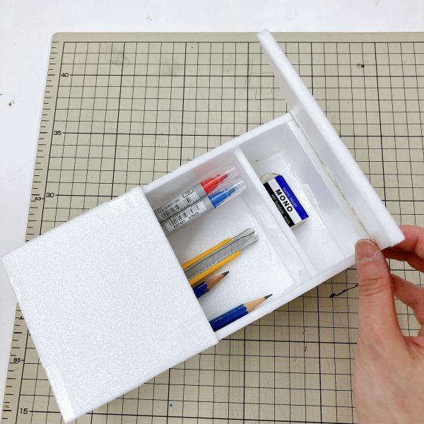 こちらは、文房具を立てたまま取り出せるデザイン。これは実際使う時に便利そう!ふたも開け閉めできます。パッと開いて、中のものを選びやすそうですね。模型の段階でアイデアがしっかり固まっていたので、制作の工程を見ていてわくわくしました。
