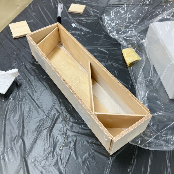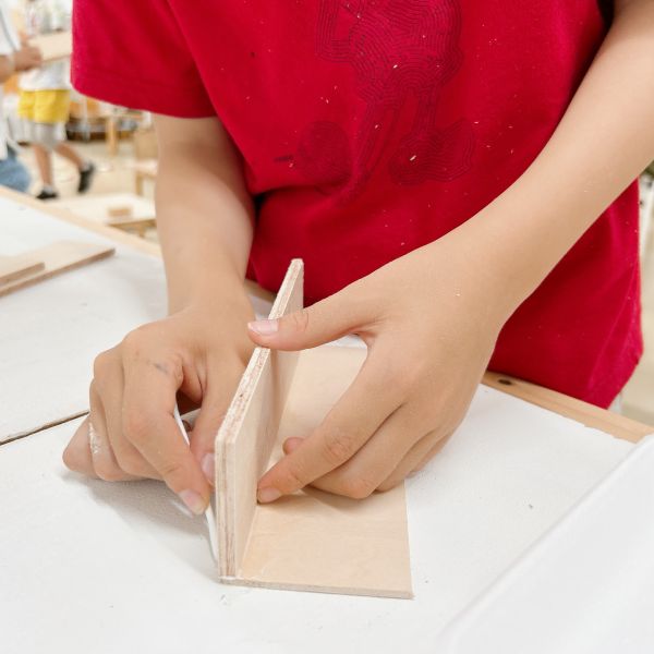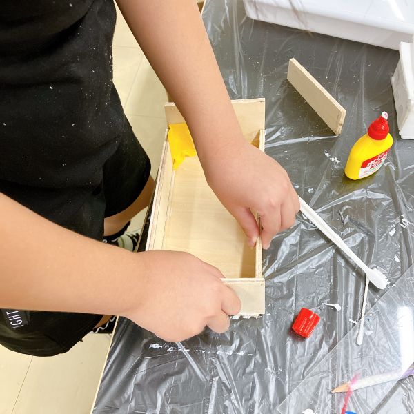 本体ができてきて、ふたの構造を考え始めて、急に「スライド式にしてみたい」と工夫をはじめた子も。細い角材をガイドに使うことで、ふたを横にスライドする形にできそう!とのこと。