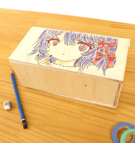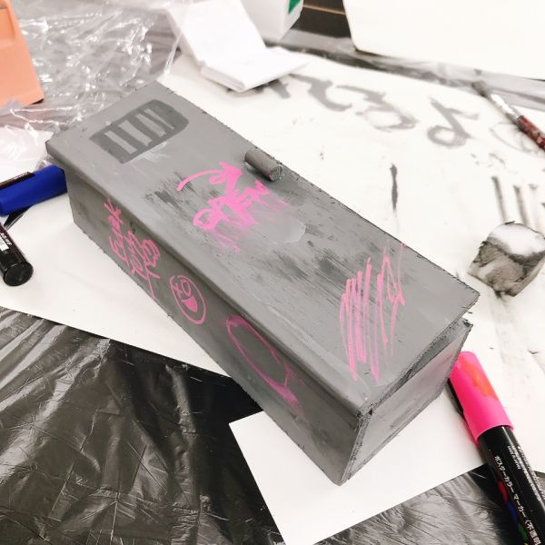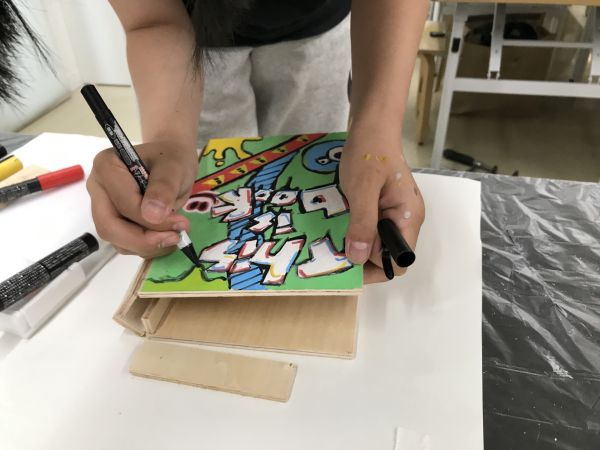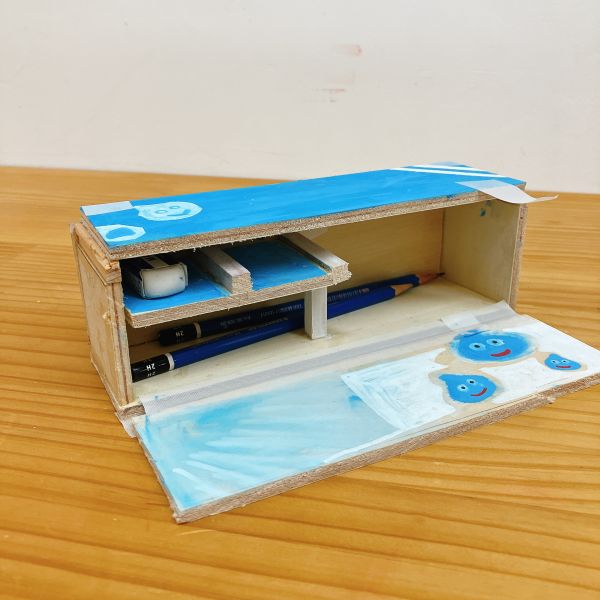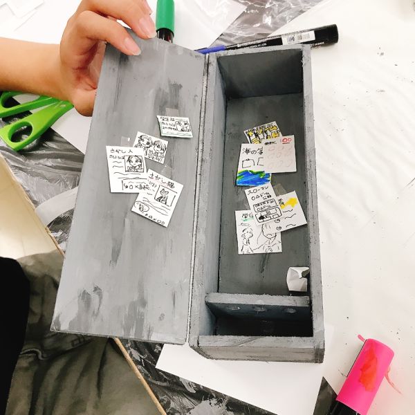 こちらは、木のペンケースが、あっという間にロッカー風に?! 「アメリカの映画っぽく」ペイントした上に、汚し風の質感を加え、ミニチュアサイズの貼り紙まで!すごい勢いで制作したようで、雰囲気がガラリと変わって驚きです。