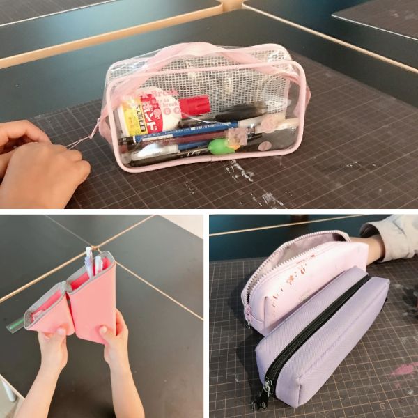 「私はなんでも入れたい!」と、大容量のペンケースを作った子も。お絵描き道具もクラフト道具もなんでも入る!わあ、スティックのりも、定規もペンも、ぴったりサイズでスッキリだ!
