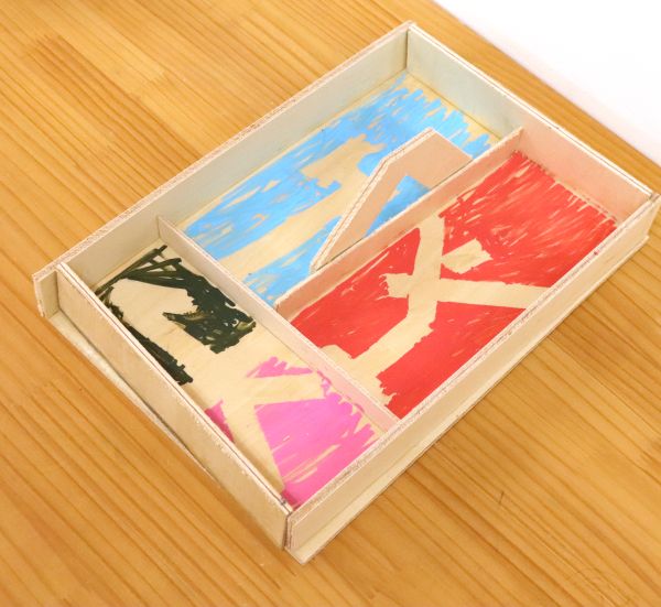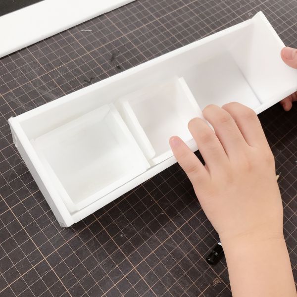 「引き出し」のデザインは、こども心をくすぐるらしい。いや、大人でもそそられる!いろんなものを整理したい人にとっては、きっちり分けられるこの形は魅力的。ただしサイズの微調整がとても難しく「も、もうちょっと…!(はいらない!)」と、最後まで微調整をがんばっていました。