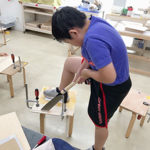 「ギコギコ」のこぎりを押し引きする動作は、腕(というか実は全身)のいろんな筋肉を使います。いくつか必要なパーツを切っていくうちに、教室のあちこちから「う…腕が!」「ぷるぷるする...」などの声が。できるだけ軽く押し引きするのがコツですよ!