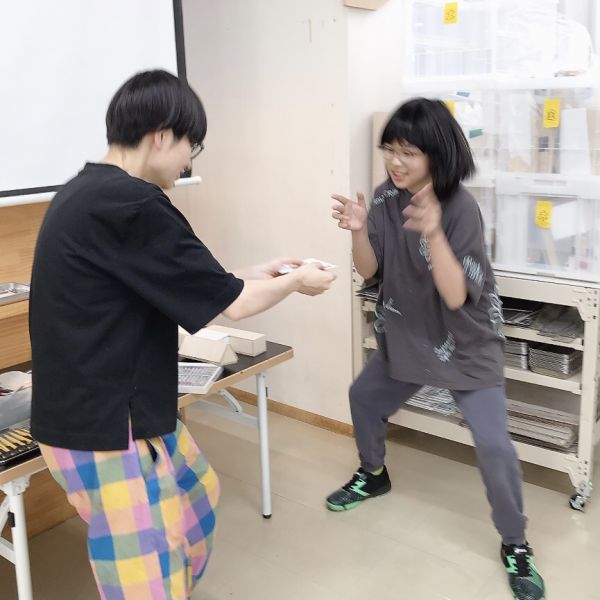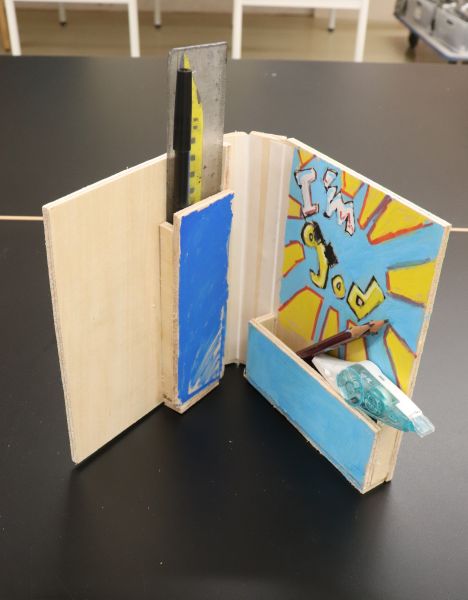 お!こちらは、本の形のペンケースを作っているようです。なぜこれを発想したのか聞いてみると「早弁ができそうだから」とニヤリ。…確かに、開いた状態で立てて置くことができるのは新しいかもしれません。さらに本棚に収納することもできそうだし…意外な形ですが、実はかなり実用的かも?!