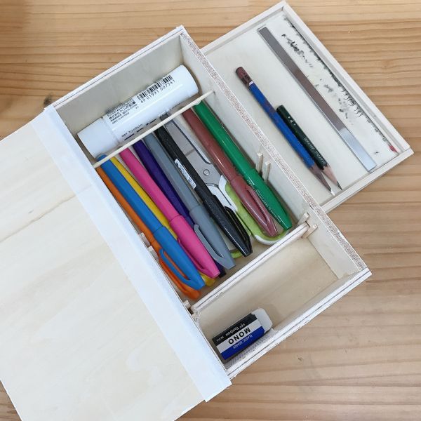 おっ!? と思わず目を引いた、ななめの仕切り。たまたま実験していて見つけたアイデアのようで「これ、なんかよくない?意外と使いやすいし」と本人もお気に入りの様子。だんだん小さくなる鉛筆とか、背の高さに合わせて位置を変えられそうだね。