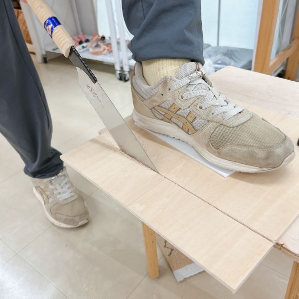 はじめに、切るもののセッティング方法から、のこぎりを持つ際の姿勢まで、大事なポイントをいくつか伝達。一歩間違えると自分が怪我をしたり、あるいは周りの人に怪我をさせてしまうかもしれない道具です。周囲への「気遣い」や、環境整備の「安全チェック」がとても大事です。