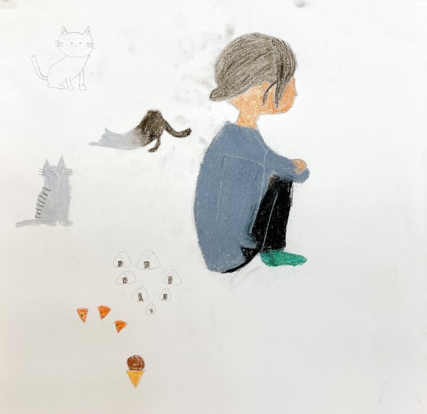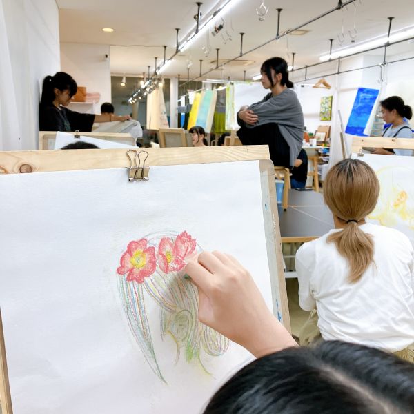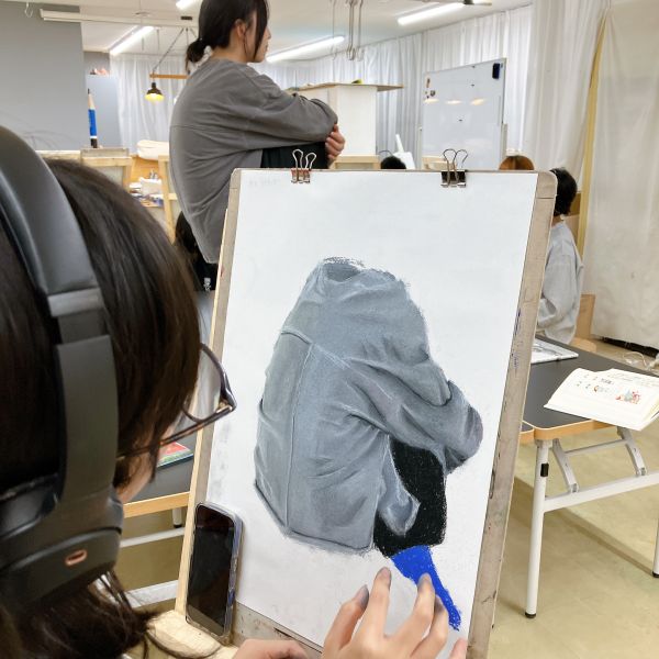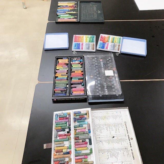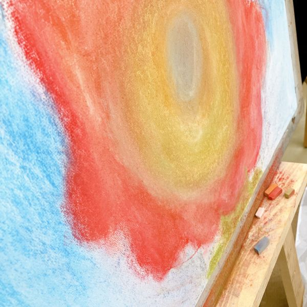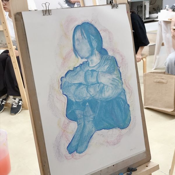 こちらは「暖かさ、やさしさ」を表現するために、パステルを選んでいました。粉の画材は、ぼかしの表現などにも適しています。まだはっきりとした形になっていないイメージを、少しずつ、じわりじわりと描き進めていきたい様子。