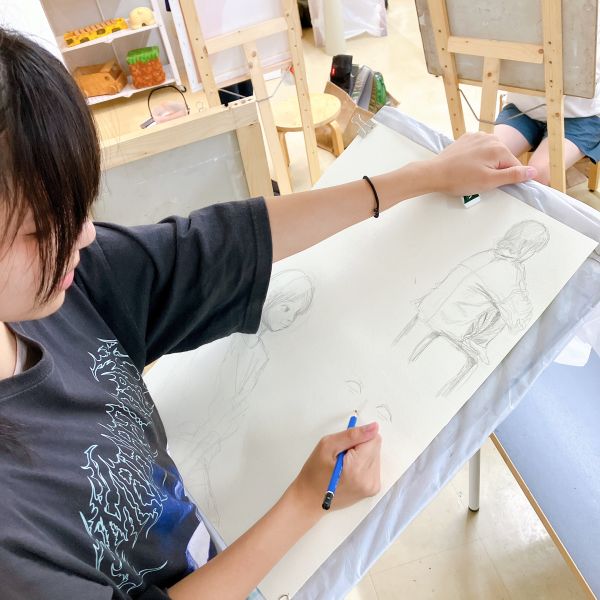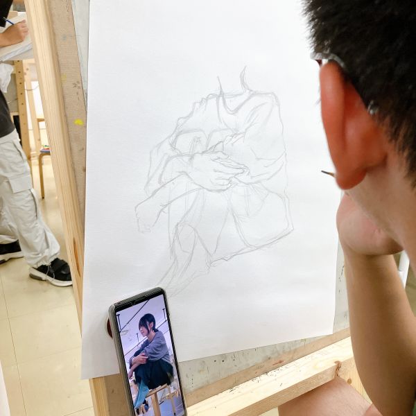 トルネードで一緒に制作していた時期もある高校生のみんなは、お久しぶりの再会となりました。さっそく、モデルのさきちゃん研究をスタート。それぞれが気になった部分に注目し、目、鼻、耳、腕、首など、その人らしさはどこに表れるのか?を探りながらスケッチしていきました。