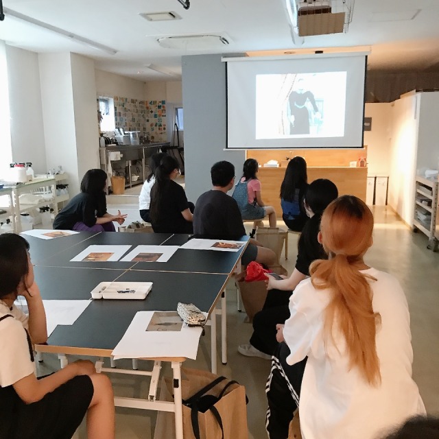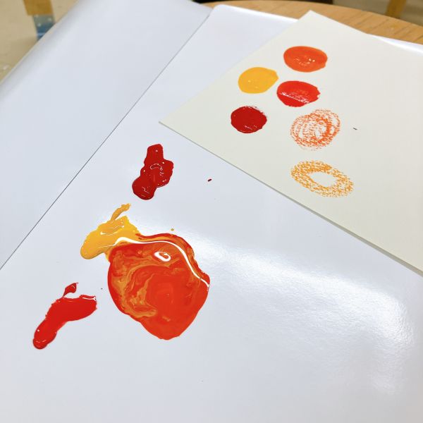 前の時間にジュニアのみんなが使っていたアクリルメディウムを、ラボでもちらりとご紹介。絵の具の色味や濃淡のほか、凸凹したテクスチャーもつけられます。「いいかも!」とさっそく自分の制作に取り入れていた人がいました。