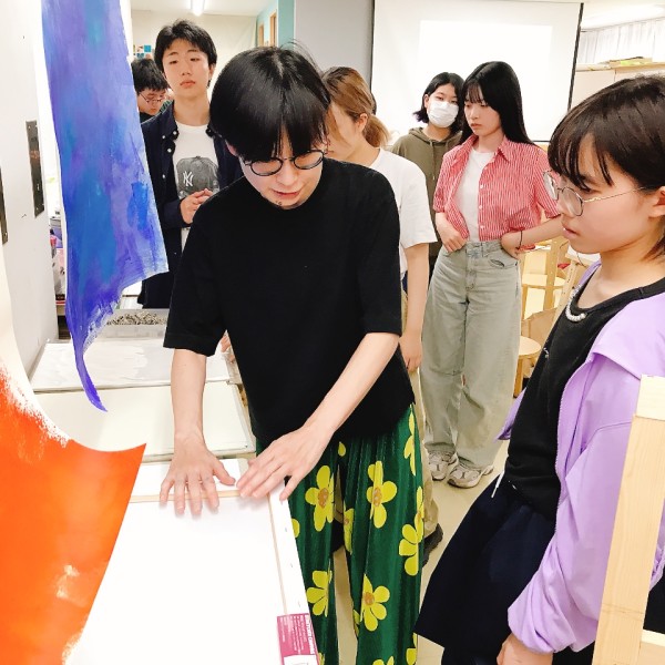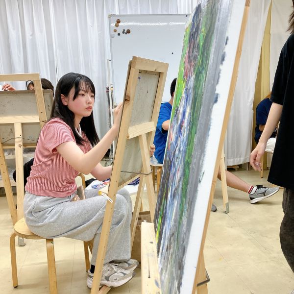白いキャンバスを前に、はじめの一筆はちょっと緊張するもの。ですがこの方は、最初からはっきりくっきりとした色を置き、思い切りの良い描きっぷり!描きたいイメージにまっすぐです。これには高校生たちも「すごい」とびっくり。