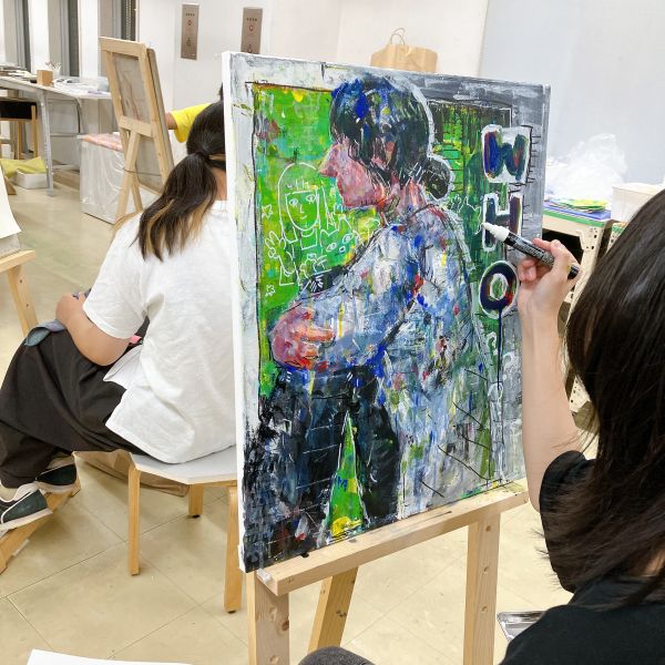 「いろんな話は聞いたけど、やっぱりまだモデルの全部を知ってるわけじゃないから、その謎さを描きたい」というこちらの方。うんうん、そうだよね。そうかんたんにその人の全てを知ることなんてできません。アクリル絵の具をいろいろな方法で重ねています。