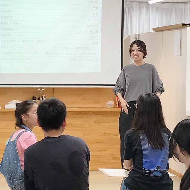 それぞれが想像して描いた絵を共有したところで、とある人が登場。「ある人」は、トルネード卒業生のさきちゃんでした!「おお〜」と思わず声があがりました。現在大学生のさきちゃんは、夏休みの帰省でしばらく札幌にいることから、今回のプログラムでみんなのモデルを引き受けてくれました。ようこそ先輩!ですね。