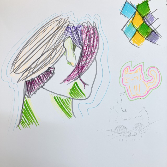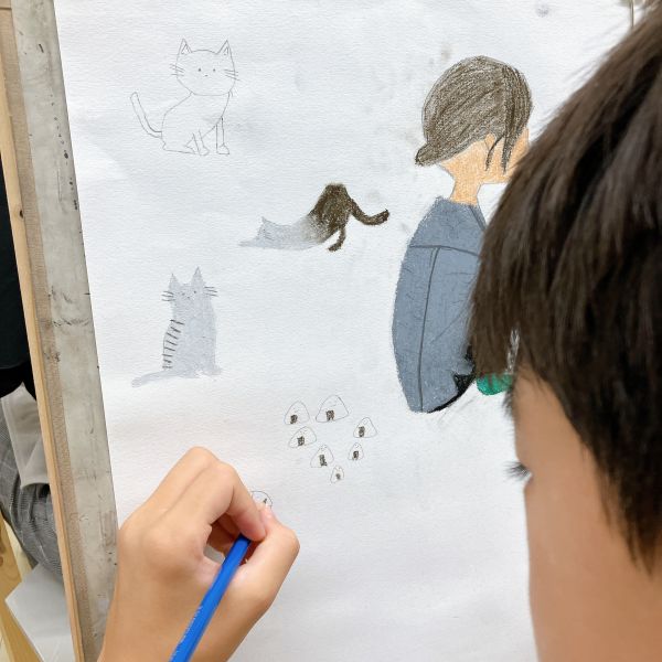 さきちゃんが登場する前から既に、「とにかく優しそうな人」と想像している子が多かったようです。その「優しそう」という部分に焦点を当てて表現しようと、こちらの人は色の構成で表現を試みていました。こういった感覚的なラフスケッチは、後々の制作でとても大事になっていきます。