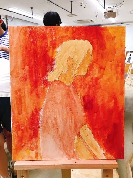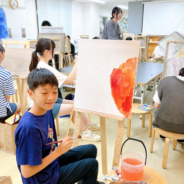 中1で今年からラボになった人の中には今回、初めてのアクリル絵画制作をするという人も。未知で、楽しみで、ドキドキ!さきちゃんの「ポジティブさ」を表現したいとのことで、明るくあったかい色合いから使ってみるとのこと。