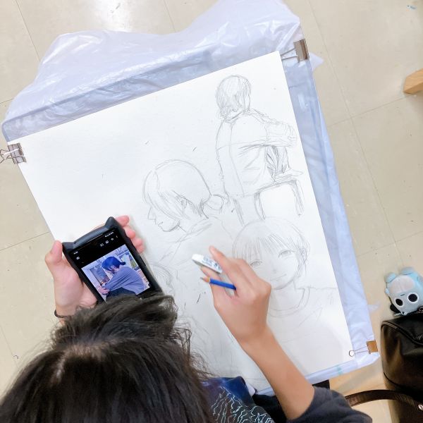 「こっちを見てください!」「笑顔でお願いします!」どんな注文にもニコニコと応じてくれるさきちゃん。トルネードでの長い制作経験があるので、みんなが何に困るのかをよく察してくれます。特定のポーズを描きたい人は、カメラで撮影させてもらい、写真も制作の参考にしていました。