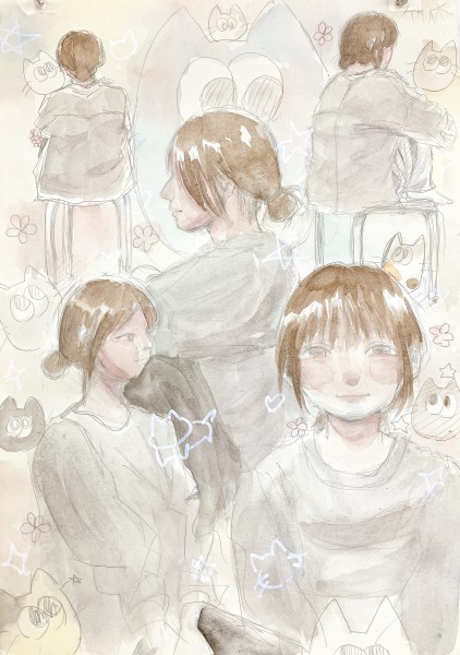 絵に描かれて「あー確かに自分っぽいかも」とさきちゃんが感じたのは、足元に一緒に描かれている飲み物の存在。何気なく置かれている様子ですが、描いた人に聞くと「描いた方が画面のバランス的に良さそうだったし、本人のものだから」とのこと。持ち物には所有者の人柄や性格がよく表れるということですね。