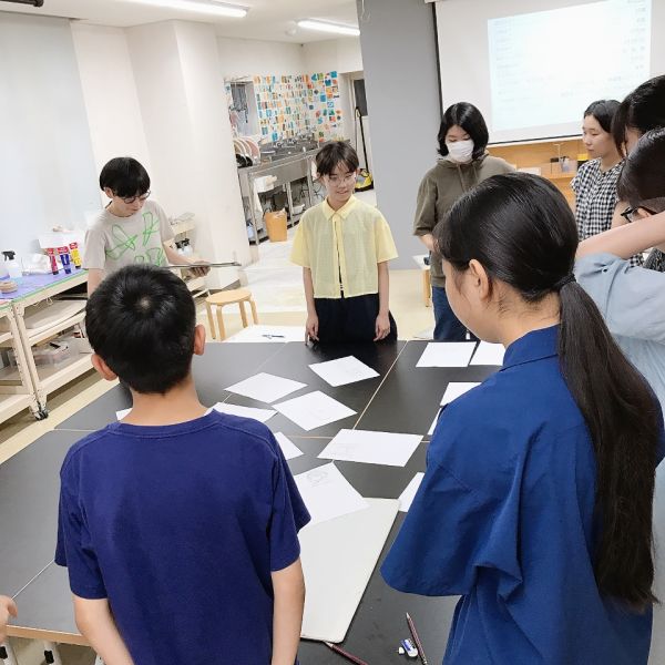 前の時間にジュニアのみんなが使っていたアクリルメディウムを、ラボでもちらりとご紹介。絵の具の色味や濃淡のほか、凸凹したテクスチャーもつけられます。「いいかも!」とさっそく自分の制作に取り入れていた人がいました。