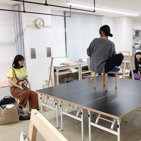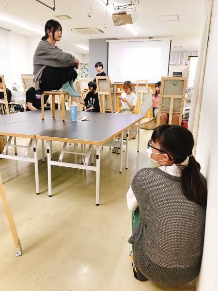 その後もみんなの制作中に同じポーズをとり続けるモデルさんは、合間にたびたび休憩をとります。おしゃべり好きなラボの子たちが多く、特に高校生は年齢が近いこともあって楽しそう。「100万円をもらうのと、1/2の確率で一千万円当たるのとどっちを選びますか?」どうにか「らしさ」を見つけたい!と質問が絶えません。