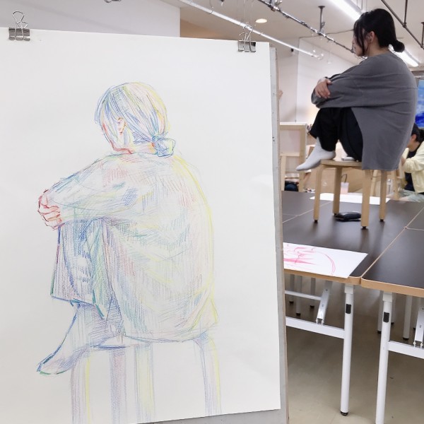 こちらは「いろんな角度からみた姿を1枚の絵に収めてみよう」と、ななめ、真後ろ、真横など、モデルのまわりをぐるぐる。場所を変えながら、さまざまな角度からのさきちゃんを描いていました。