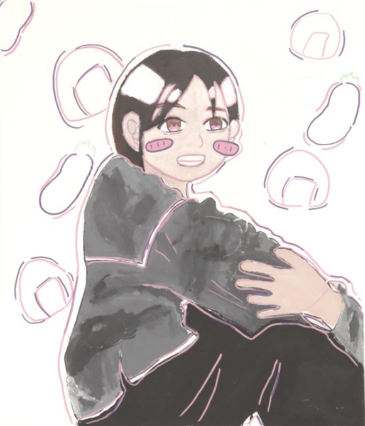 こちら、中1の男の子の作品です。画面の中に、ぽつんと小さく描かれたさきちゃん。そのまわりには、さきちゃんが教えてくれた「好きなもの」や、身近なモノたちが描き込まれています。制作の様子からは、まだまだ描き続けられそうなエネルギーが感じられるほどでしたよ。