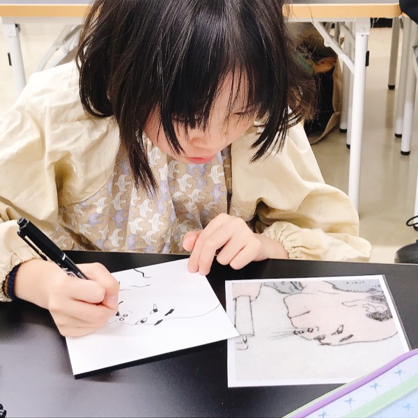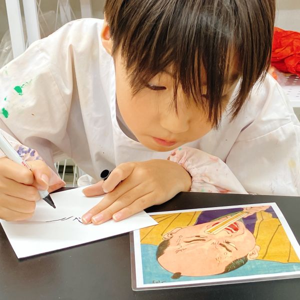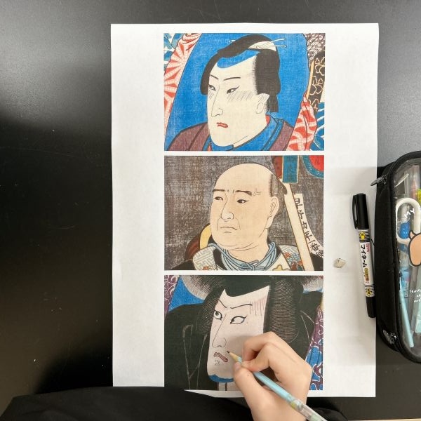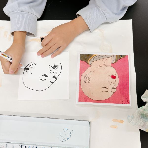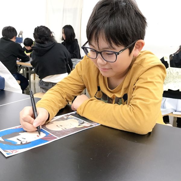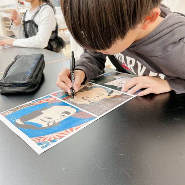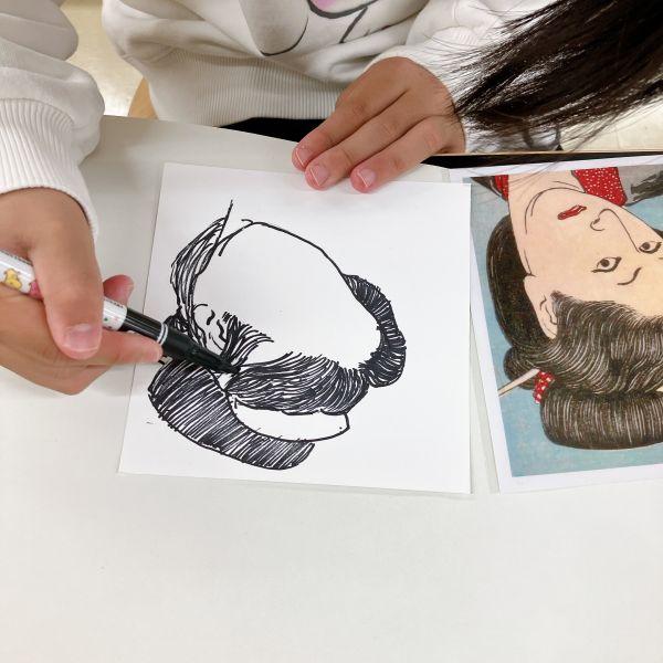 線でくっきりと描かれた浮世絵は、こどもたちも描きやすい様子。まずひとつの線の形を追い、できたら次々とその周辺にある線を付け足していくように描いていました。都度、元絵を確認しては、描き足す。
