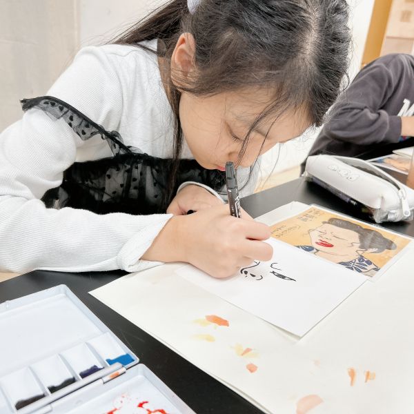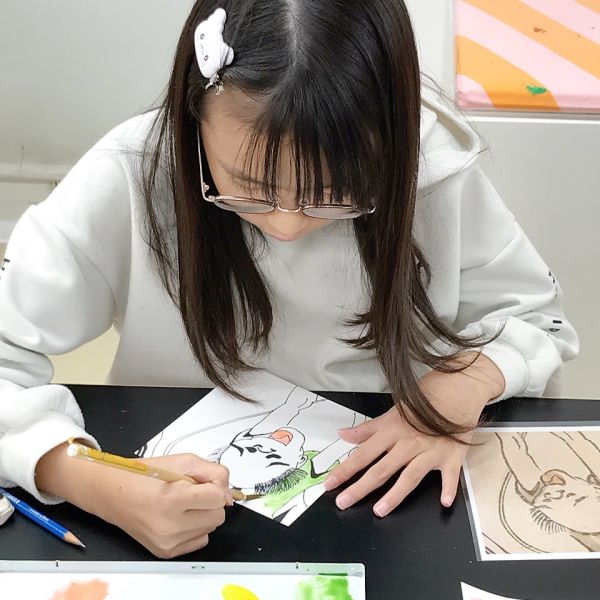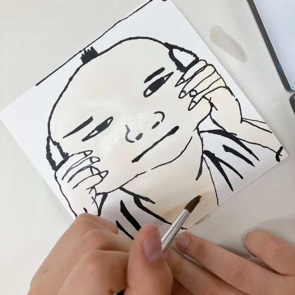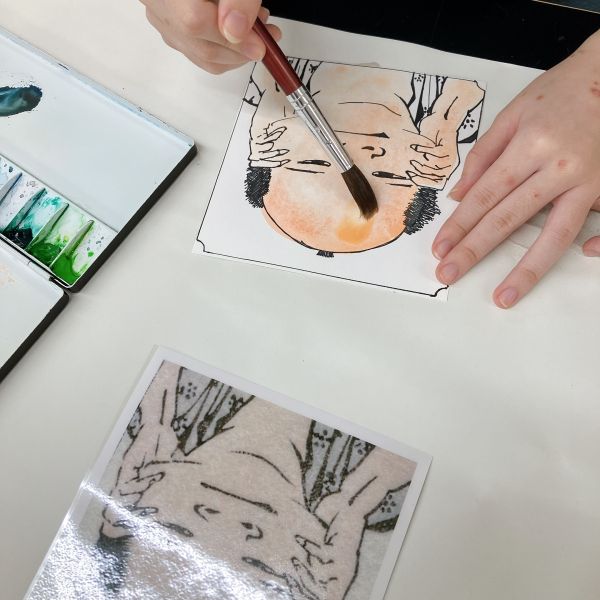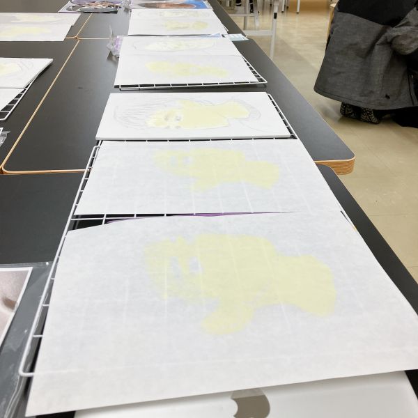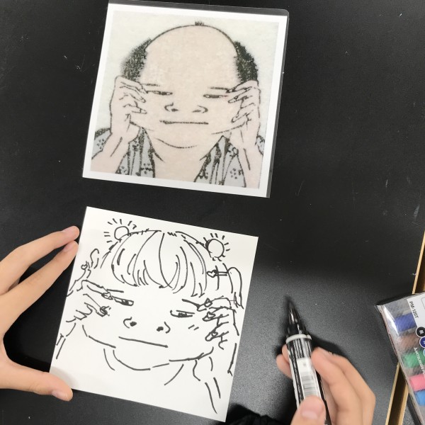 仕上げは作品と写真の間にカーボン紙をはさんで、輪郭線をトレース。普段は先に線を描き、その中に色を塗ることが多いと思いますが、今回は最後の行程に"線"を入れるのがポイント。ここで表情におかしみをプラスすることもできるので、こどもたちのやんちゃ心が沸き立ちました。
