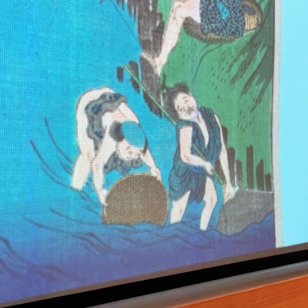 「なんかこの人、痛そうな顔してない?」「手をかまれたのかな?」よくみると頭の上から1本の線が出ています。「あ!釣られたんだ!」そうそう、釣竿の針が髪の毛に引っかかり、「いてててて!」状態。今見てもオモシロおかしい場面設定に、教室内にクスクスと笑いが。