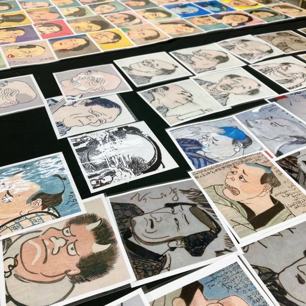 出来上がった版がずらりと並ぶと...すごくおもしろい!「マンガみたい!」「すごく焦ってる」「たしかに浮世絵っぽい!」などいろんな声があがりました。線だけで表現すると、写真よりもさらに特徴が強調されて、浮かび上がってきた感じがしますね。