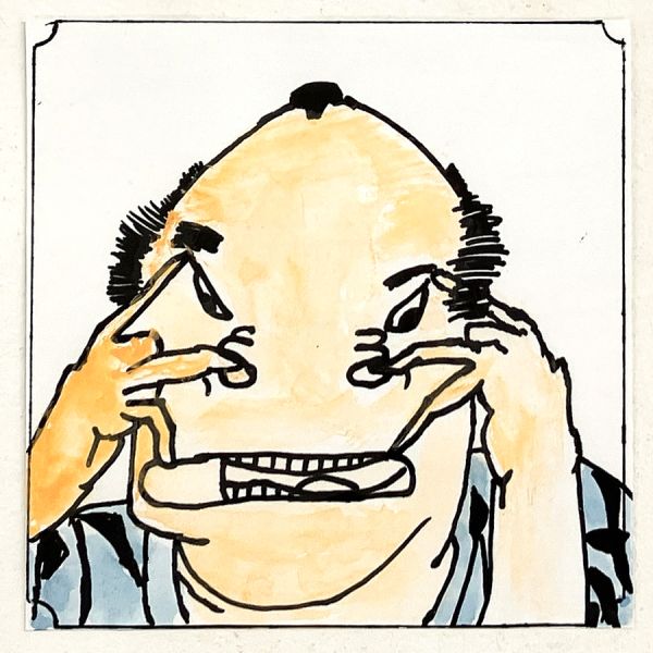 虫メガネをこちらに向けて、目元が拡大された女性。床屋で髪を切られすぎた人と、その横で指を指しながら笑い転げる人。坂でころがる柿を我先にと駆け寄って頬張る人。「そのまま食べるの!?」「そりゃひどいよ!」一枚一枚、思わずツッコミを入れたくなるような場面だらけです。