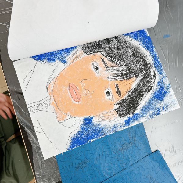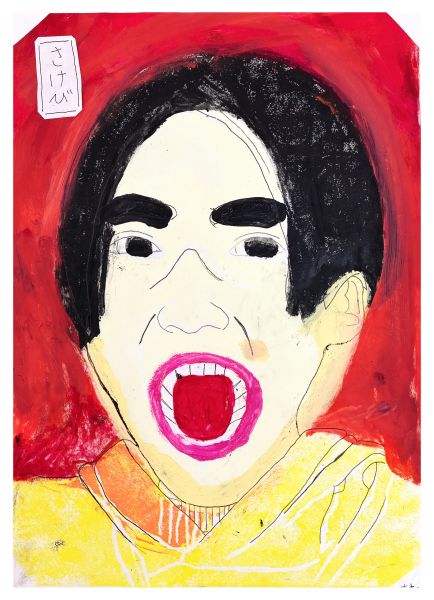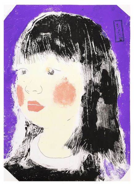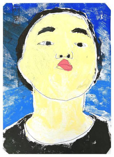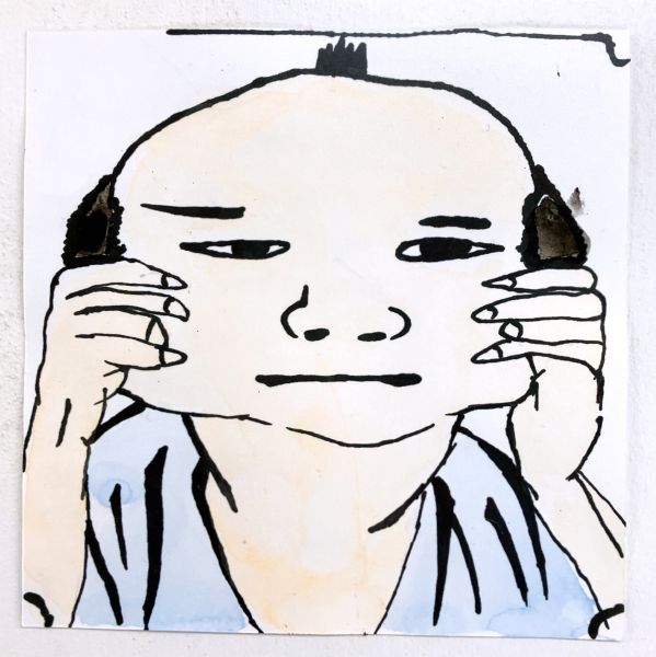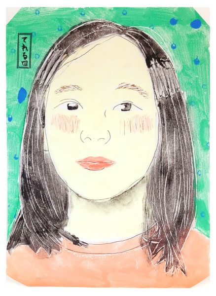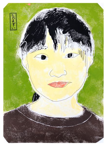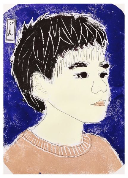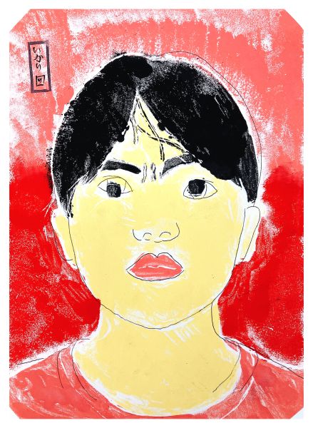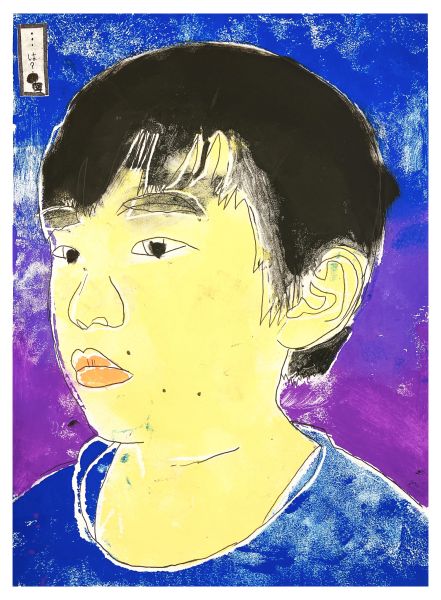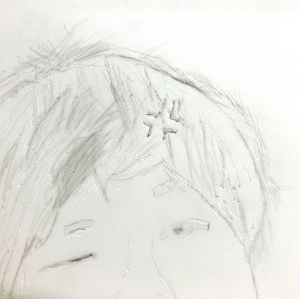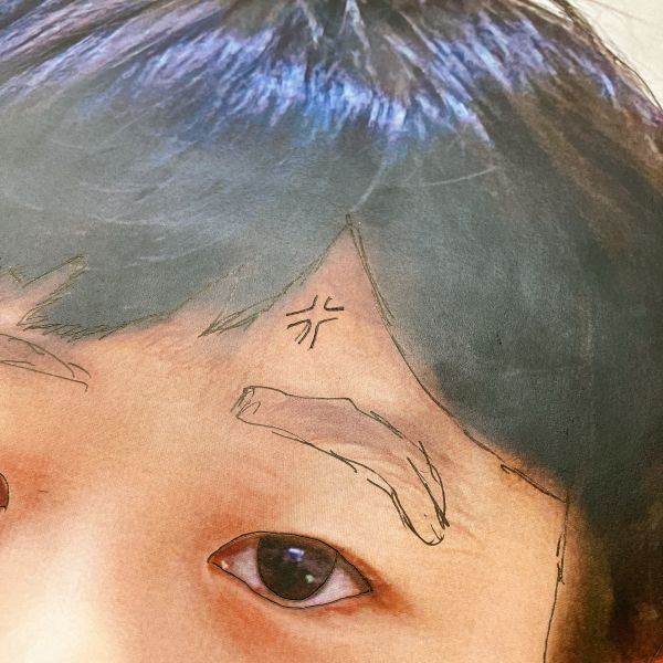 くっきりとした線が入ることで、ぼんやりとしていた表情が一気にクリアになり、力強さが生まれました。細いラインを用いた描写には、どこかアンディ・ウォーホルの作品のような雰囲気もあります。