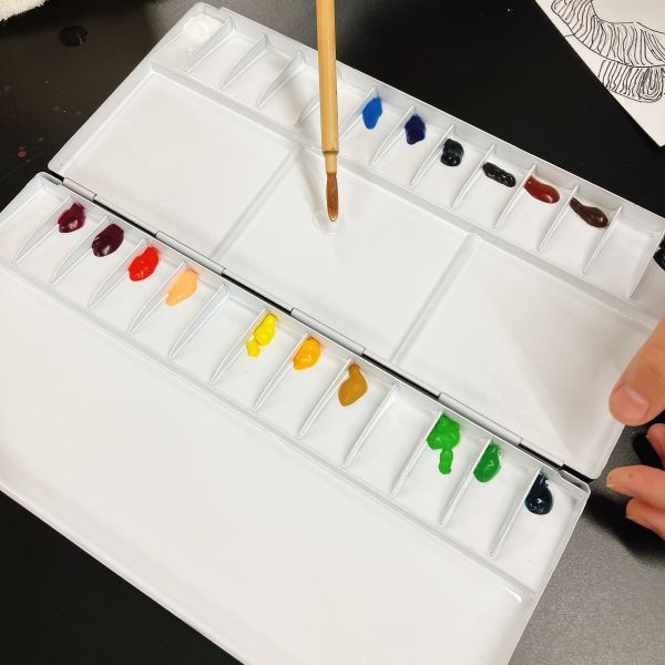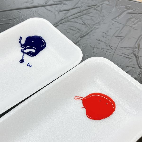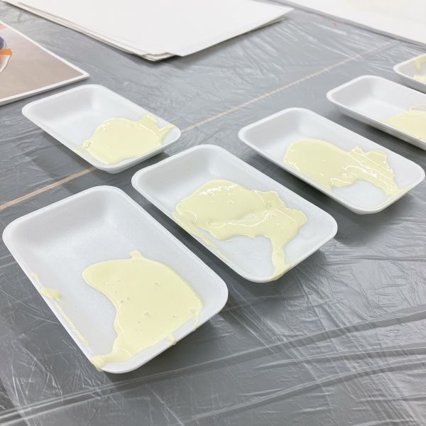 この回では、色のバリエーションが豊富で、アクリル絵の具の中でも被覆力の強いアクリルガッシュを使います。そのままでは乾燥が早いので、刷る前に色が乾いてしまわないように、グリセリンを混ぜて乾燥時間を遅らせます。