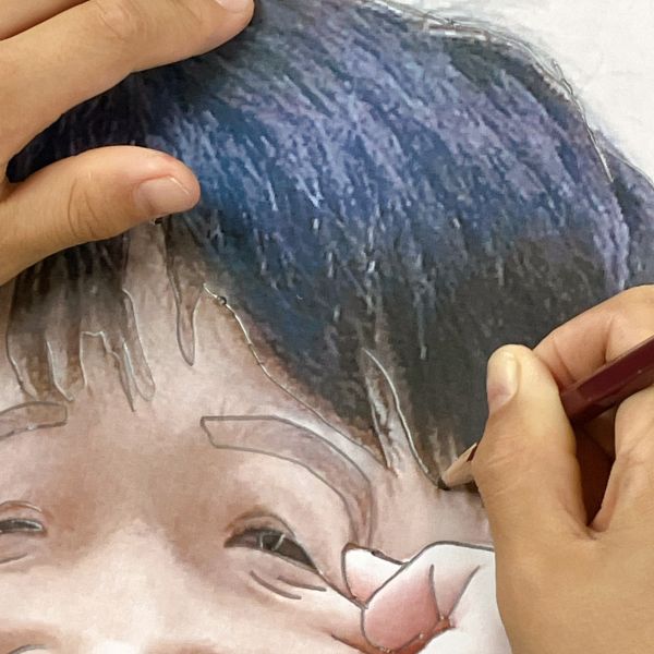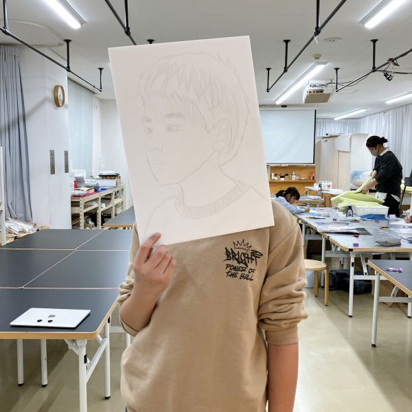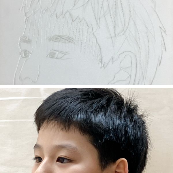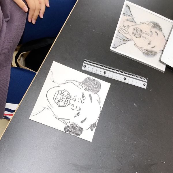 次はいよいよ、自分の顔の版づくり。先ほど撮影した写真が下絵代わりになりますが、写真には浮世絵のような"線"はありません。目鼻口はもちろん、顔の輪郭や、髪の束などをどう表現するか、自分で線を描いていく必要があります。「そっかー!」まつげやまぶたはどうする?シワはどうする?たくさん見えるなかから取捨選択したり、位置を捉え直したり。