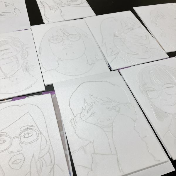 両方とも試してみて、自分の制作に合う方法を選ぶことにしました。実際にやってみると「この方法はこういういい面もある」「意外とむずかしい」などの発見も。どちらの方法でも、最終的に描いた線が凹で表現できていたら、版の完成です。