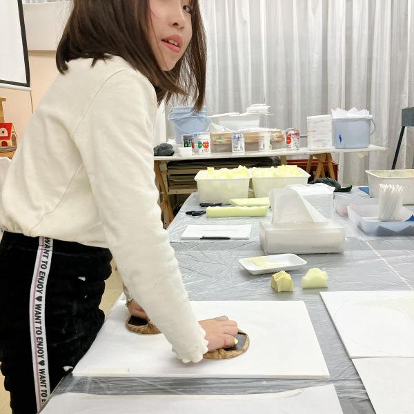 ここからが、版画の「本刷り」です。前回のテスト制作で、インクののせ方や、ばれんの力加減などを少し体験しているので、それぞれ感覚を掴んでいる様子。版画制作では、予期せず偶然出てくる表情やニュアンスが多々あります。良い感じが表れたら、しっかり作品に生かしていこう!
