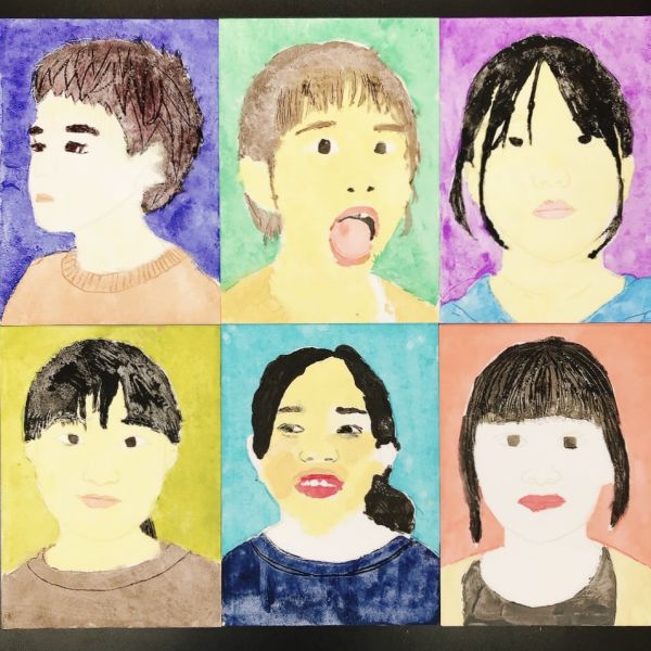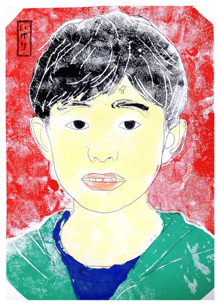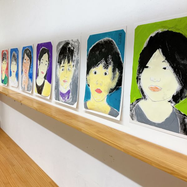 みんなの生き生きとした表情が、配色や版画の風合いとマッチして、浮世絵風自画像に仕上がりました。ずらりと並べて遠目で見ると、どれが誰の作品なのかが一目瞭然でオモシロい!