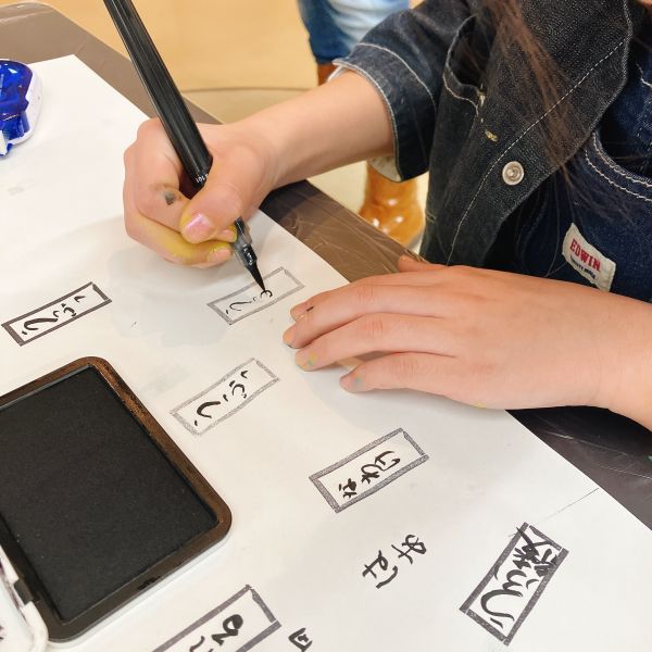 彫り師体験の次は、刷り師体験です。版にていねいに版画インクを塗っていきます。インクの量や塗り方も、実際に試しながらちょうどいい加減をつかんでいきました。さらに版画の大事なポイントは、絵柄が反転すること。文字で試せばそれがよくわかりますね。