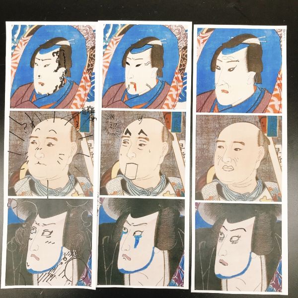 そこで浮世絵の顔部分を拝借してみることに。多くが平坦で、シンプルに描かれた顔ばかりですが...ちょっといたずらしたくなりませんか...?どれだけ笑える顔にできるか、いたずら描きしてみよう!「えっ!いいの?」「おもしろそう!」