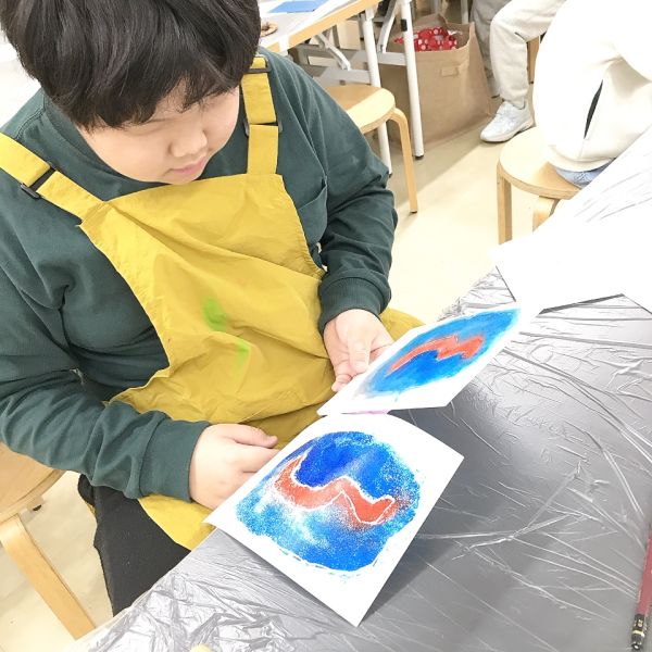 しっかりこすったら、ゆっくりはがして確認です。ドキドキ…はじめは「色が全然のってなかった」「なんか薄い!」ということもちらほらと。面積が広いと、刷る前に色が乾くこともある様子。「もう一回重ねよう」「グリセリンを増やすか…」それぞれで工夫していました。