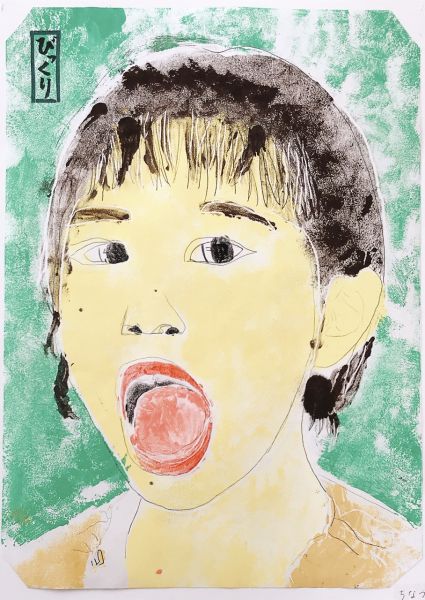 みんなのおもしろい顔は、「びっくり」や「怒り」、「暑い」「眠い」などいろんなテーマがありました。タイトル風に筆文字で描きこんでみたり、作家のサインとして落款(ハンコ)風に仕上げたり、細かな工夫をしていました。みんなこういうの得意ですね。